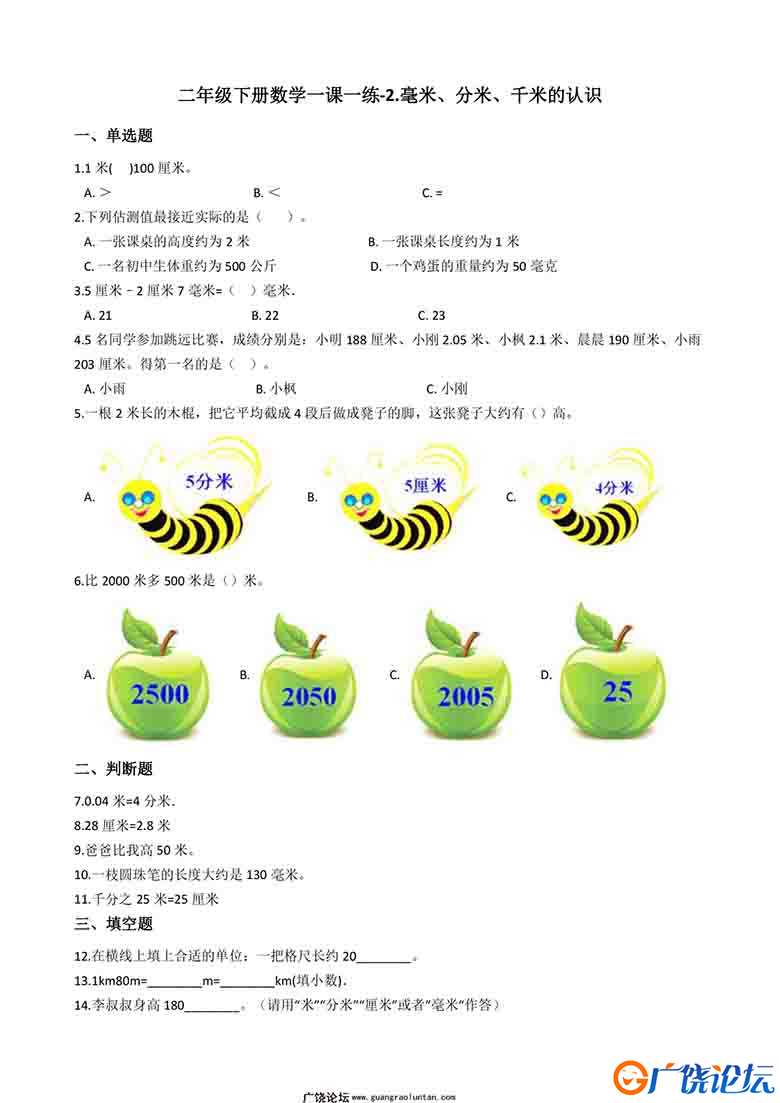 二年级下册数学一课一练-2.毫米、分米、千米的认识 青岛版(五年制)(含答案).pdf