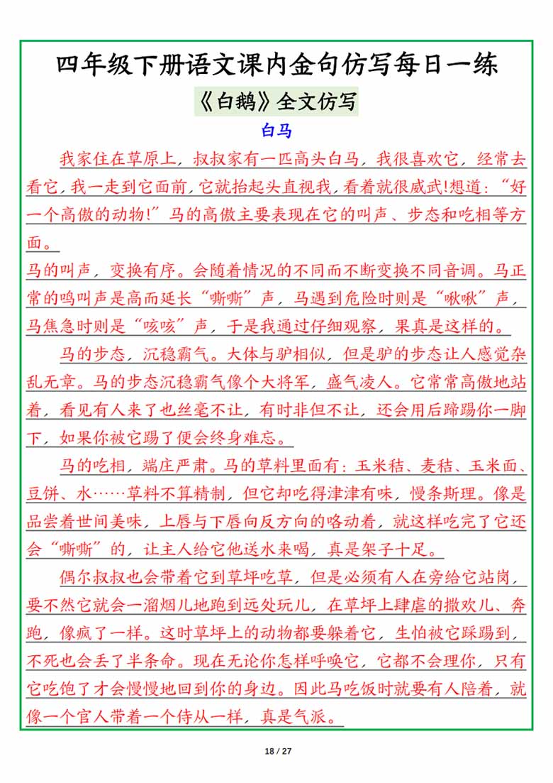 四年级下册语文课内金句仿写每日一练读背版,27页PDF可打印学习资料
